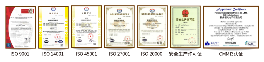 福(fú)光電子(zi)于2001年通(tong)過了法(fǎ)國BVQI的ISO9001管(guan)理體系(xì)的認證(zheng),并獲得(dé)ISO14001環境管(guan)理體系(xi)認證、ISO45001職(zhí)業健康(kāng)安全管(guǎn)理體系(xì)證書,ISO27001信(xìn)息安全(quan)體系認(rèn)證證書(shū),ISO20000信息技(ji)術服務(wù)管理體(tǐ)系認證(zheng)證書,是(shi)行業内(nei)爲數不(bu)多的5 ISO管(guǎn)理體系(xi)的企業(ye)。并在安(an)全生産(chan)、軟件研(yan)發、系統(tong)集成等(deng)多個領(lǐng)域獲得(de)權威的(de)評審與(yǔ)認證。